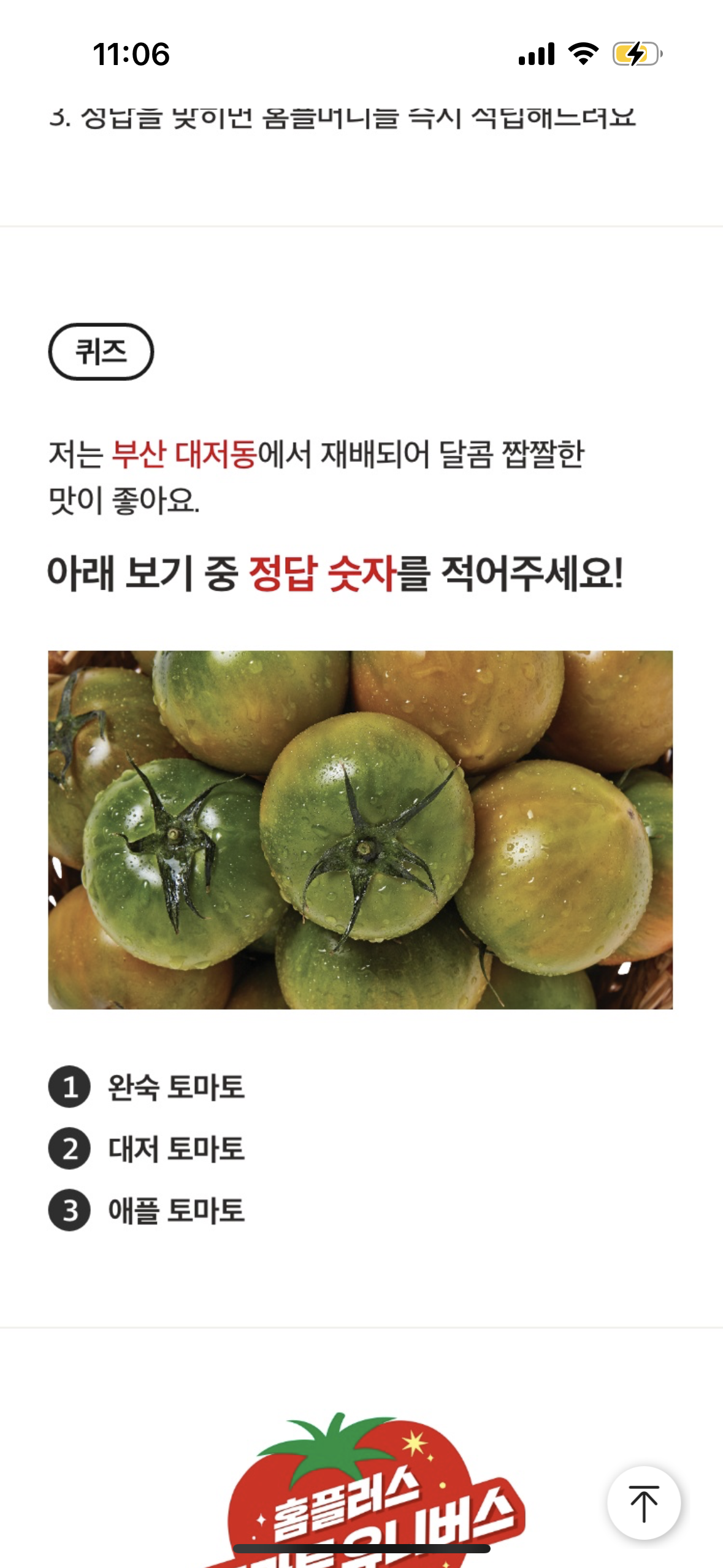 아래 보기 중 정답 숫자를 적어주세요!1. 완숙 토마토2. 대저 토마토3. 애플 토마토