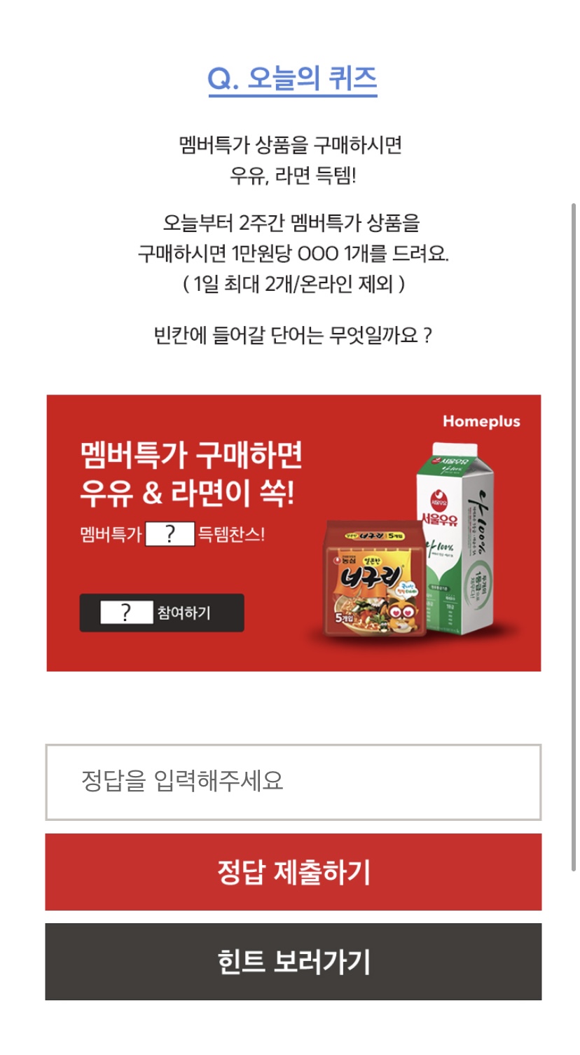 → 해당퀴즈는 홈플러스 어플 접속 및 로그인 - 오른쪽 상단바 - #어머 이 혜택은 홈플퀴즈클릭
