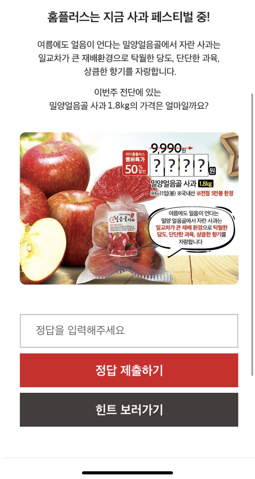 [마이홈플러스퀴즈] 2022년 4월 16일 "밀양얼음골사과" 홈플퀴즈타임정답 (+퀴즈찾는법)
