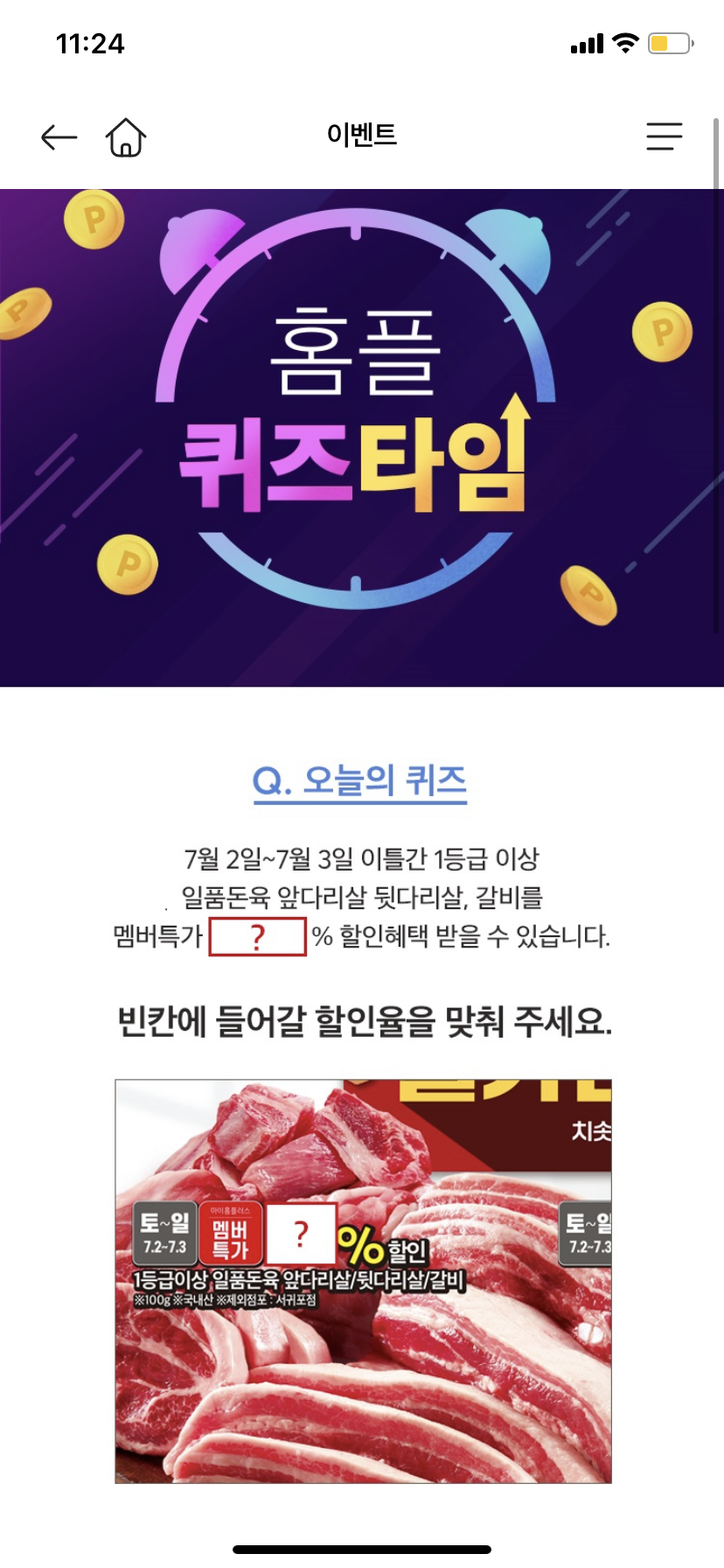 → 해당퀴즈는 홈플러스 어플 접속 및 로그인 - 오른쪽 상단바 - #어머 이 혜택은 홈플퀴즈클릭
