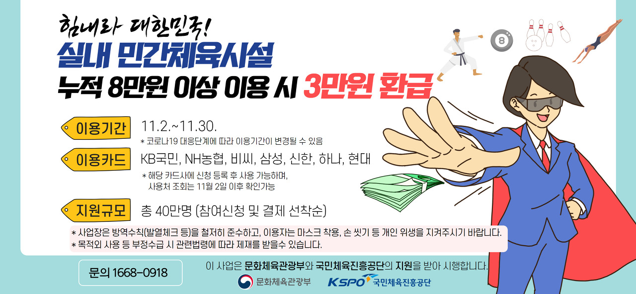 2. 소비할인권을 받은 참여자가 11월 2일(월)부터 30일(월) 해당 사업기간 동안 체육도장, 체력단련장 등 실내 민간체육시설 이용료 누적 8만 원 이상 결제하면 선착순 40만 명에게 12월 15일(화)에 3만 원을 환급되는 과정
